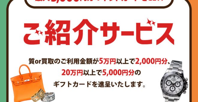 < お得な「紹介サービス」がスタートしました!! > ご紹介された方が5万円以上 […]