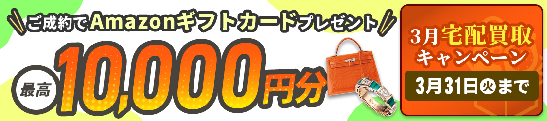 ※一部対象外品がございます。(ロレックスの新品・未使用品、地金類など)※一度のお取引でご成約金額が上記金額に達した方が対象です。(複数回のお取引による金額の合算は対象外)※ご利用回数の制限はありません。※一部の他サービス・キャンペーンとは併用できません。
